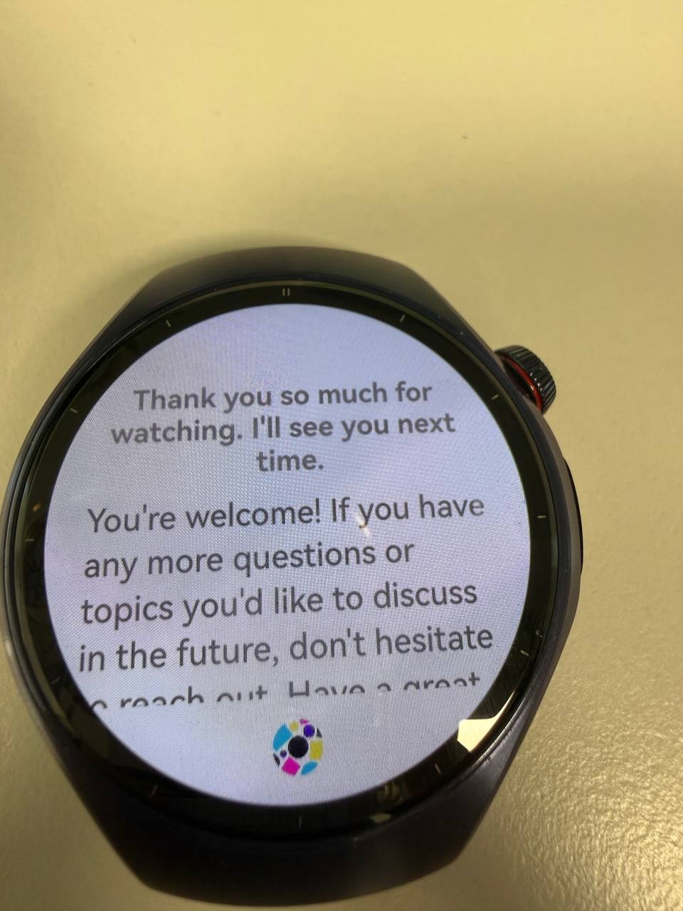 This demo presents a lightweight wearable application for real-time voice interaction with AI on HarmonyOS. Users can start speaking by tapping the Oniro icon, and the app will capture their speech, transcribe it into text, translate it into English, and forward it to a GPT model for response.